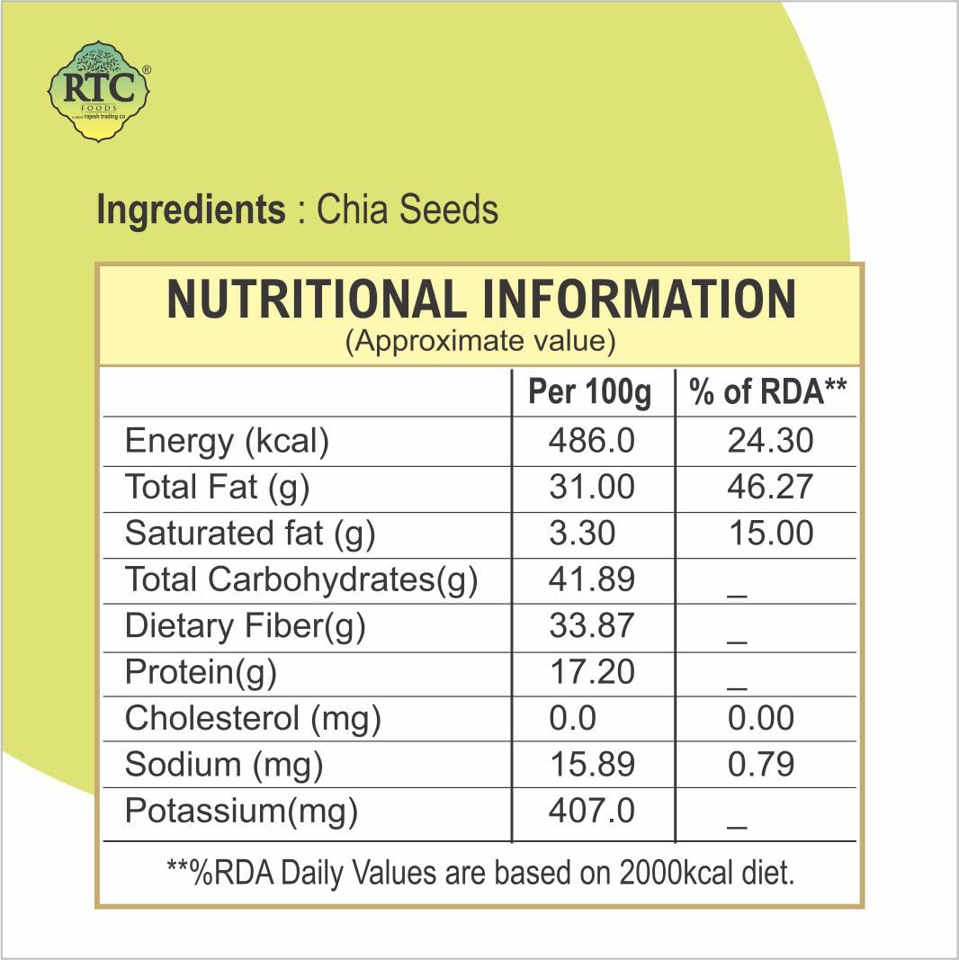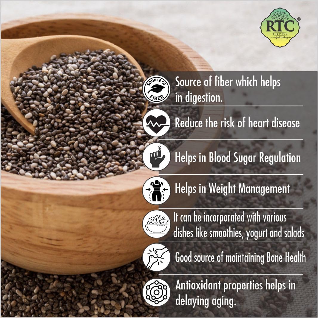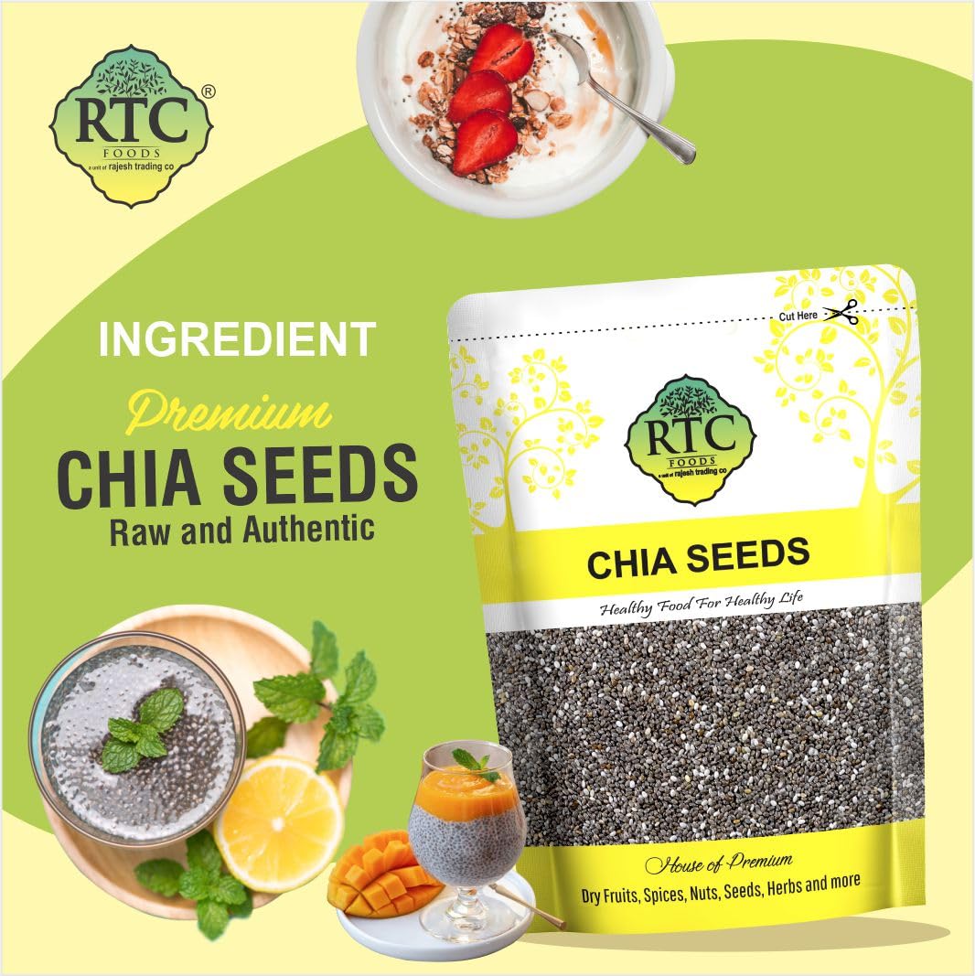 “RTC Foods Chia Seeds are premium-quality seeds known for their mild taste, natural crunch, and exceptional nutritional value. Hygienically processed and securely packed to preserve freshness, they are a perfect addition to daily wellness routines. Rich in fiber, plant protein, omega-3 fatty acids, and essential minerals, RTC Foods Chia Seeds support balanced nutrition and healthy living”